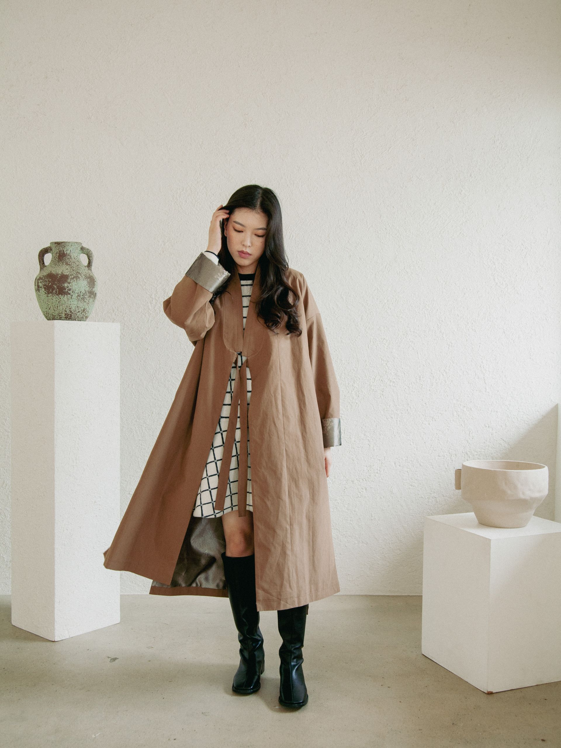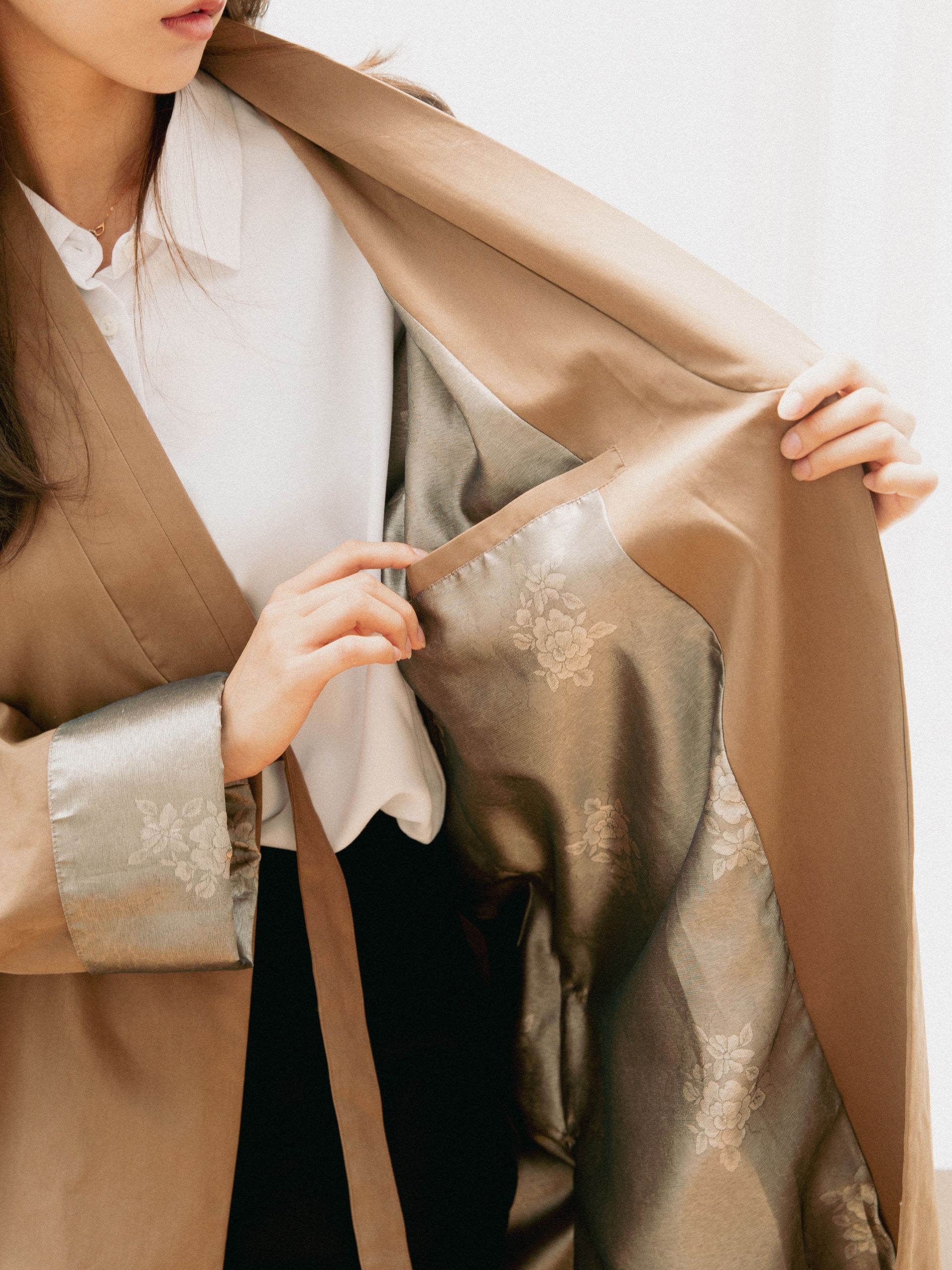 창옷과 두루마기의 멋스러운 형태를 재구성하고, 한복지를 사용한 안감으로 포인트를 준 간절기 코트 입니다.